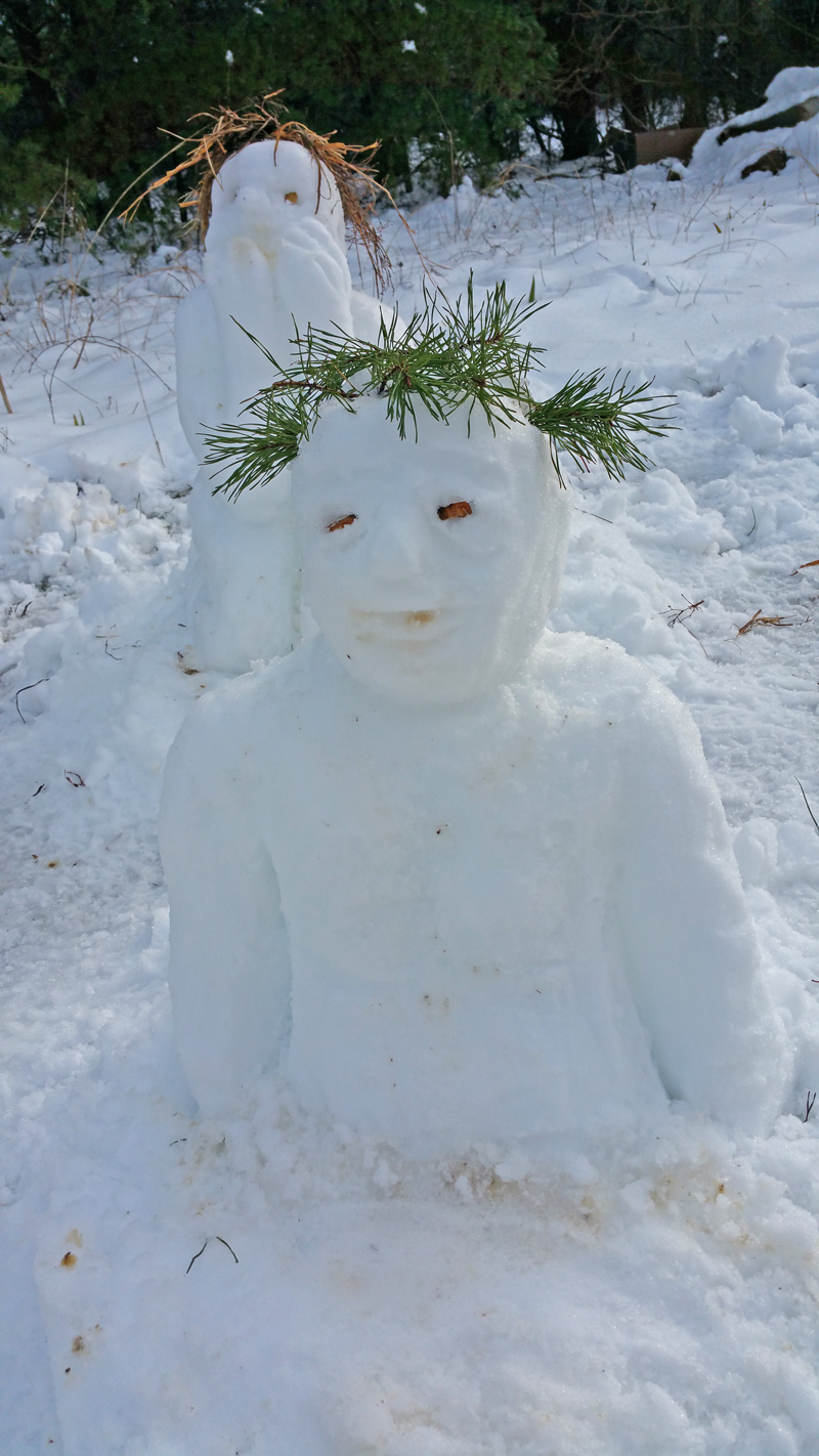 Ever since I published that post the other day about the romance between two snow people in my yard, snow people have been springing up everywhere around my house! I don’t know what they want. Maybe my yard has become a dating mecca for snow singles, or maybe they just want their pictures in my blog. Maybe they are just starved for attention. They’ll be gone when it warms up later today – I hope.