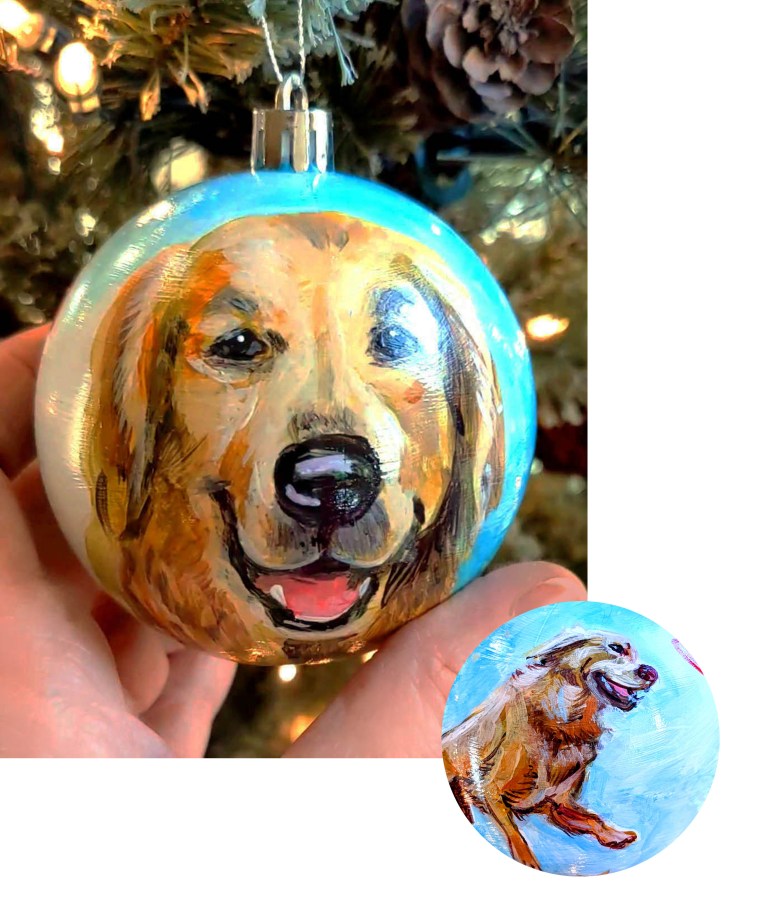 One-of-a-kind, keepsake collectibles. Fine acrylics, finished with varnish, are used to paint unique, whimsical designs. If you’d like a portrait of a loved one, I can work from the photographs you provide. An attractive gift box with ribbon is provided for each ornament.