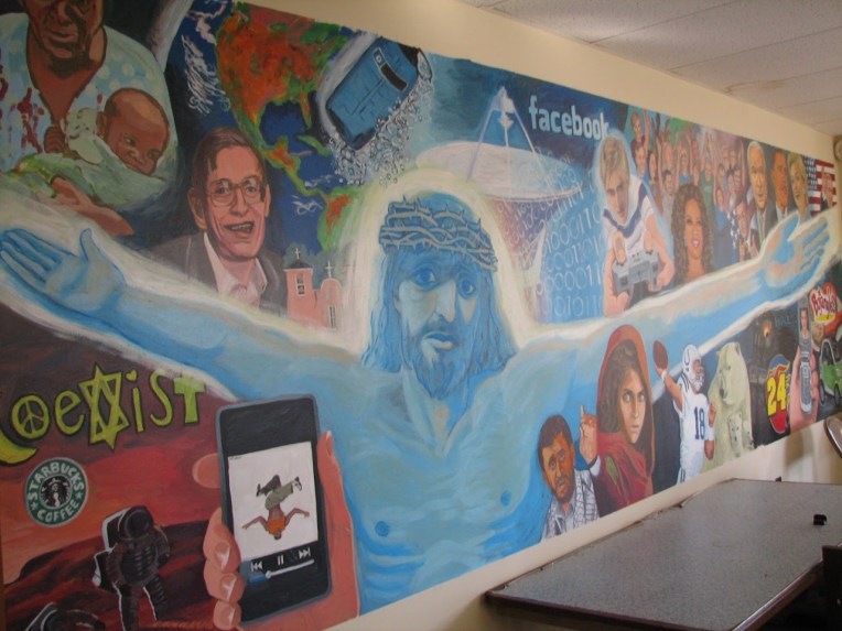 Years later (circa 2008?) I created a 17’ x 5’ indoor wall mural mixing acrylic CMYK colors. A different process (no dots!), but with surprisingly effective results. I worked with a Presbyterian youth group, and we discussed the things that occupied their minds, and how Christ fit in between all of that. I painted Christ using an approximation of “non-photo blue”, which was a light cyan that avoided detection in the days of reproducing mechanical ink drawings photographically. You would use non-photo blue pencils and pens to draw lines, then ink them in. I thought that a non-photo blue Christ in the midst of all the temporal things that are so sharply inked in our lives might be a nice epistemological contrast.
